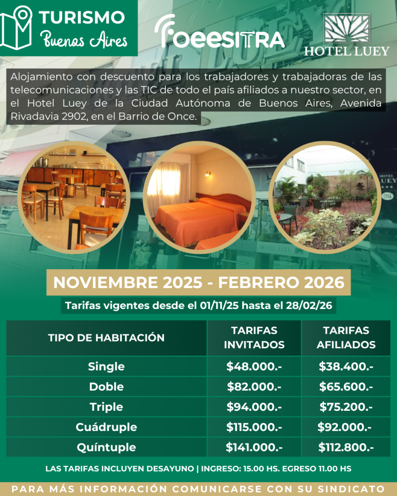 Alojamiento con descuento para los trabajadores y trabajadoras de las telecomunicaciones y las tics de todo el país afiliados a nuestro Sector, en el Conquistador Hotel de la Ciudad Autónoma de Buenos Aires, calle Rivdavia 2902