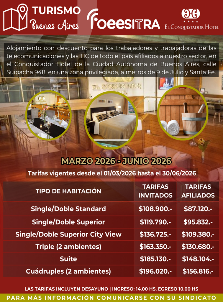 Alojamiento con descuento para los trabajadores y trabajadoras de las telecomunicaciones y las tics de todo el país afiliados a nuestro Sector, en el Conquistador Hotel de la Ciudad Autónoma de Buenos Aires, calle Suipacha 948.