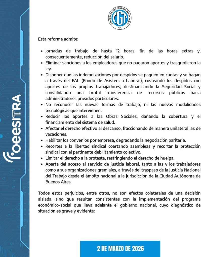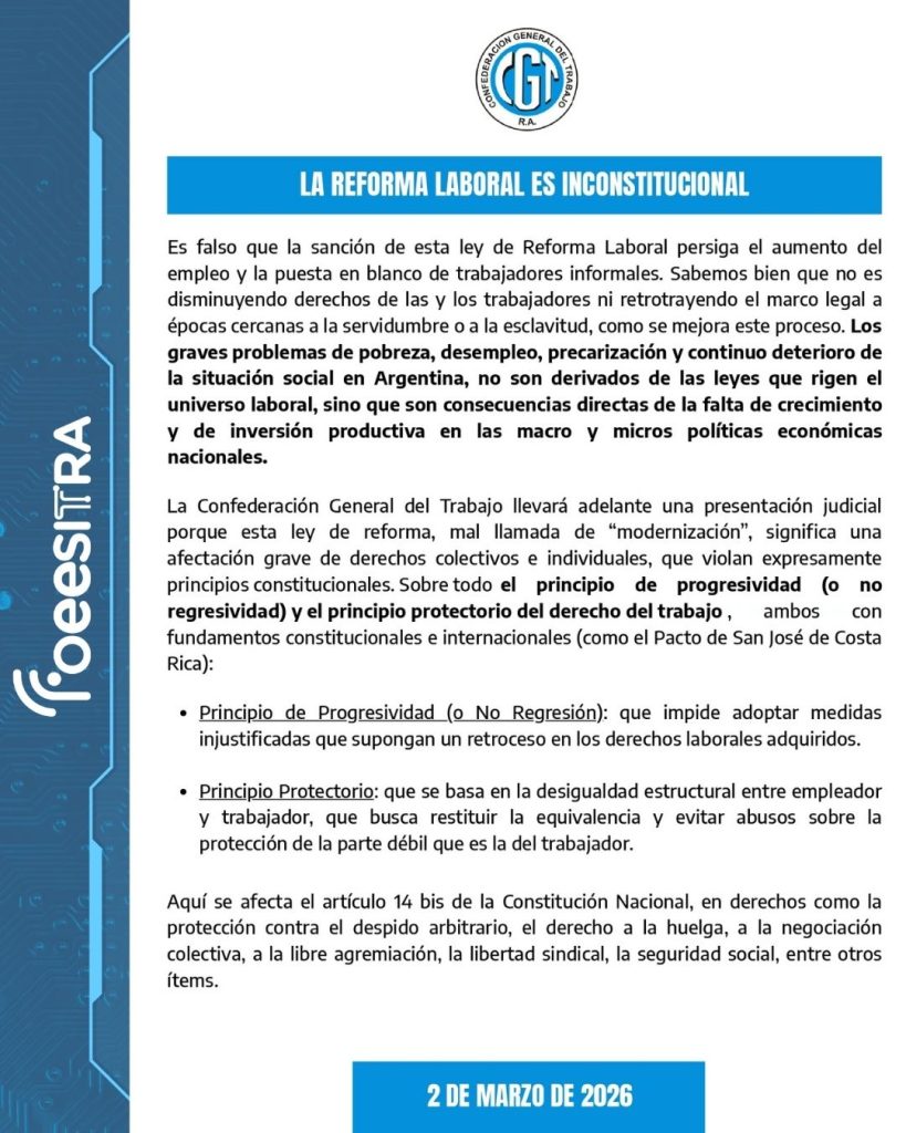 La Confederación General del Trabajo llevará adelante una presentación judicial por considerarla una afectación grave de derechos colectivos e individuales, que viola expresamente principios constitucionales.