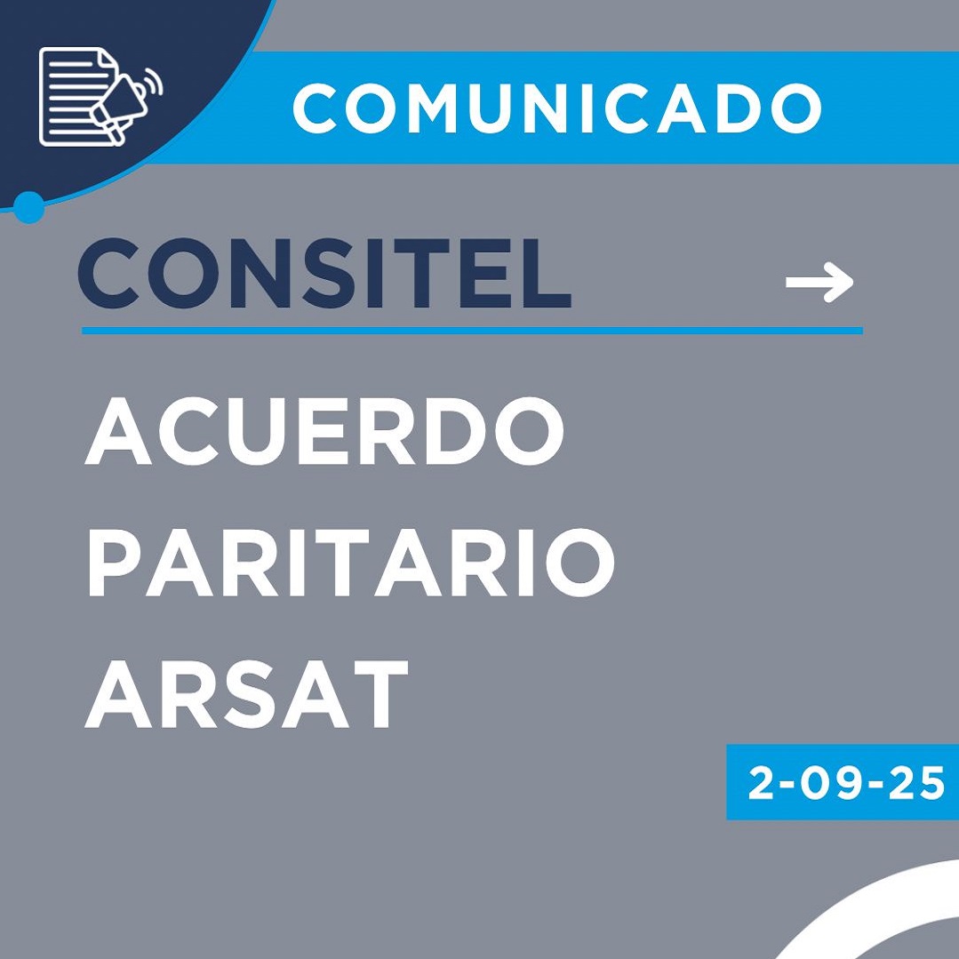 Novedades Sindicatos Mes de la prevención contra el cáncer de mama. ver más » octubre 3, 2025 Sindicatos ENCUENTRO NACIONAL DE LA CONSITEL ver más » septiembre 18, 2025 Sindicatos ACUERDO SALARIAL SEPTIEMBRE 2025 ver más » septiembre 11, 2025 Sindicatos ACUERDO PARITARIO ARSAT ver más » septiembre 2, 2025 Sindicatos SE PROFUNDIZA EL CONFLICTO CON ARSAT ver más » agosto 27, 2025 Sindicatos CONTINUAMOS EN LA LUCHA PERMANENTE POR ARSAT ver más » agosto 25, 2025 Sindicatos Comunicado de la CONSITEL Acuerdo Salarial Agosto 2025 ver más » agosto 21, 2025 Sindicatos Comunicado de la CONSITEL Paro y Movilización por la situación de ARSAT ver más » julio 31, 2025 Page1 Page2 Page3 Page4 Page5